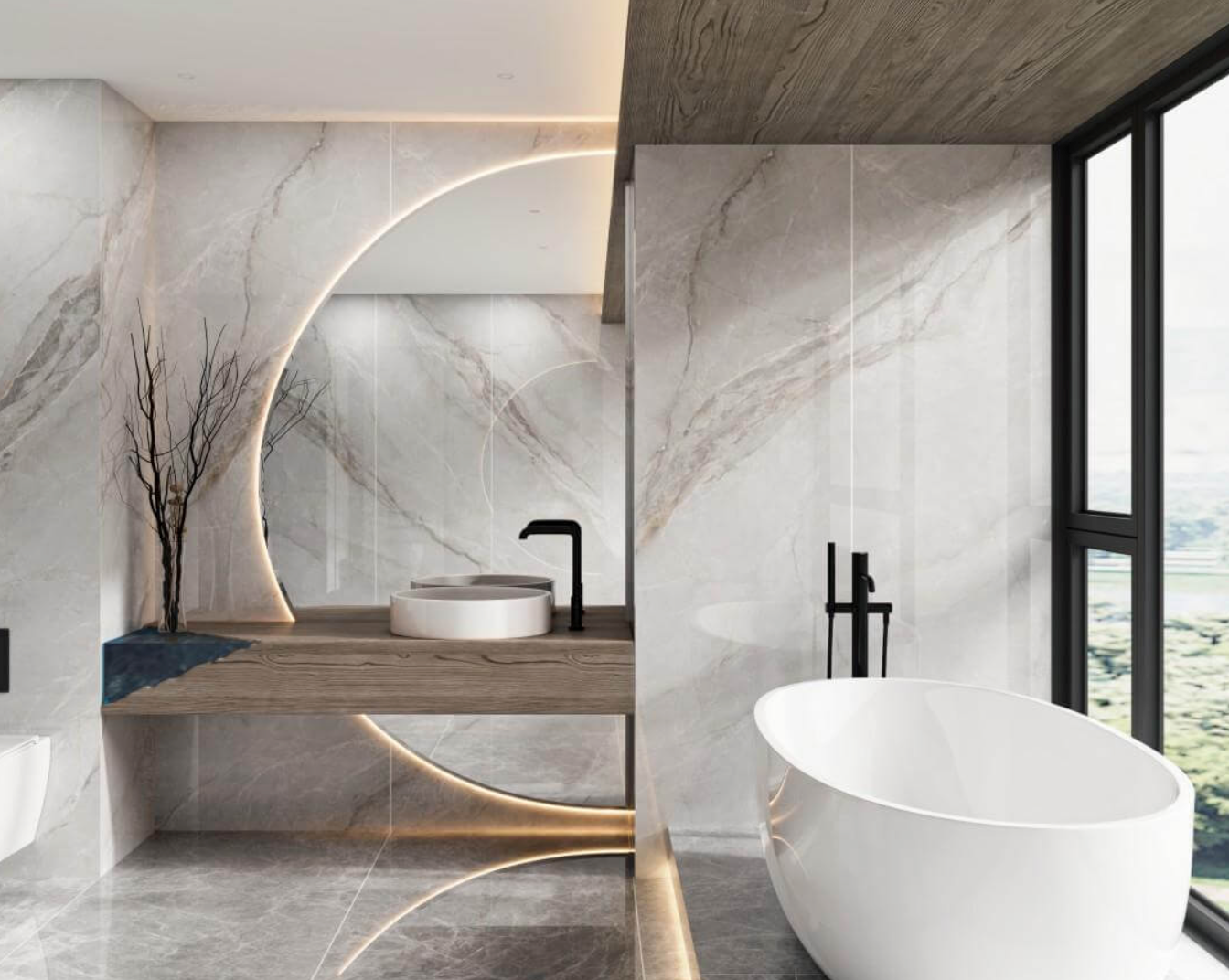 岩板是一種新型的人造石材,主要由非常純正礦物質白泥末在高壓下燒結而成 比起瓷磚更加具有高硬度、耐磨、耐高溫、耐腐蝕、防水、防污、防火等優點,並且可以切割成各種形狀和規格,廣泛應用於室內外裝修,如檯面、牆面、地面、傢俱等。
